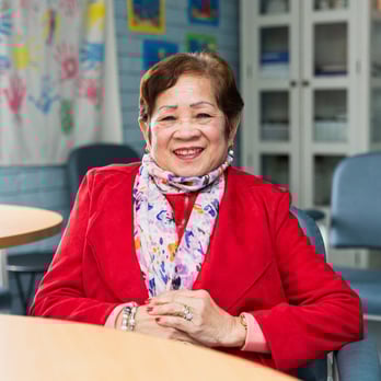 Elderly Asian man sitting in an arm chair talking with a VMCH pastoral care worker